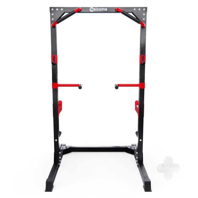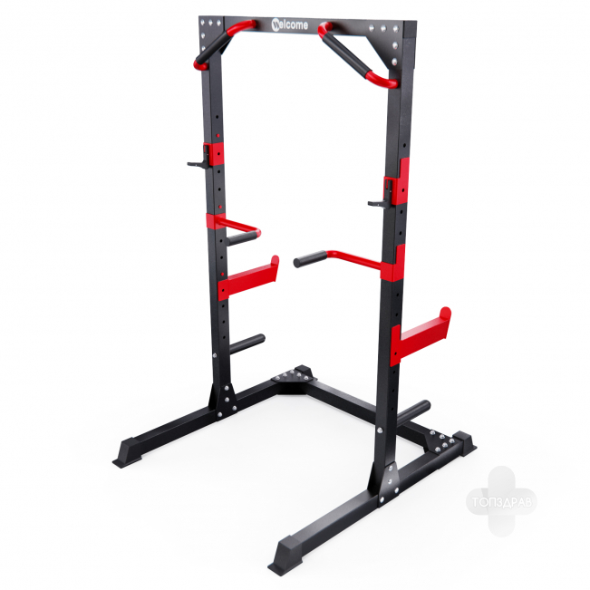 Силовая рама, стойка для штанги с подстраховкой DFC WRK-5100 – многофункциональный тренажёр для домашних тренировок. Серия тренажеров WELCOME выполнена в современном дизайне, где яркий красный цвет гармонично сочетается с элегантным черным. Продуманная геометрия и контрастное цветовое решение позволят тренажеру гармонично вписаться в любую комнату и стать ярким акцентом вашего интерьера. Это идеальное решение для тех, кто ценит функциональность и эстетику в каждой детали своего дома. Устойчивое основание стойки для приседаний из высокопрочной профильной трубы 50 х 75 х 1,5 мм выдерживает нагрузку 200 кг. Подходит для выполнения полного спектра упражнений со штангой: от приседаний и становой тяги до жима лежа. Нескользящие рукоятки для подтягиваний диаметром 25 мм и пара поручней для отжиманий помогут дополнительно разнообразить ваши тренировки. 2 пары держателей для штанги регулируются на 12 уровней по высоте. Максимальная нагрузка на держатели штанги 150 кг. Для хранения дисков предусмотрены 2 держателя по углам тренажера длиной 25 см (диаметр 25 мм), а также переходная втулка (диаметр 50 мм). Максимальная нагрузка на каждый держатель для дисков 60 кг. Нескользящие ножки надежно устанавливаются на полу и не царапают поверхность.